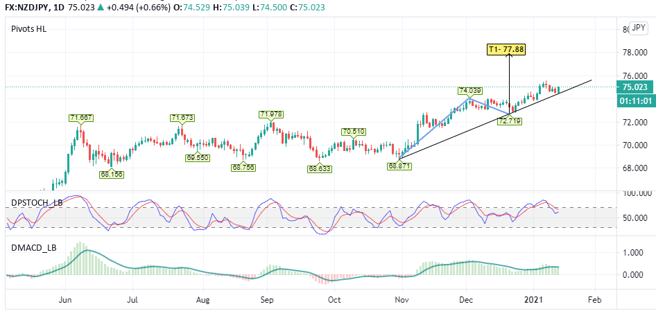 Regarding upside targets on the daily chart, the primary one is 77.88, which the NZDJPY pair last visited in December 2018. This price is based on the DiNapoli levels (68.67 / 74.03 / 72.71 ) as shown. The area of 72.71 may also become an area of support should the current trend breakdown and develop bearish tendencies.